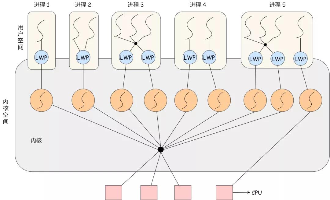 根据前面的两个模型混搭一起,就形成 M:N 模型,该模型提供了两级控制,首先多个用户线程对应到多个 LWP,LWP 再一一对应到内核线程,如上图的进程 3。