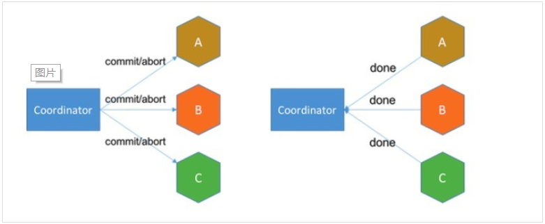 如果事务在每个参与者上都执行成功,事务协调者发送通知让参与者提交事务;否则,协调者发送通知让参与者回滚事务。