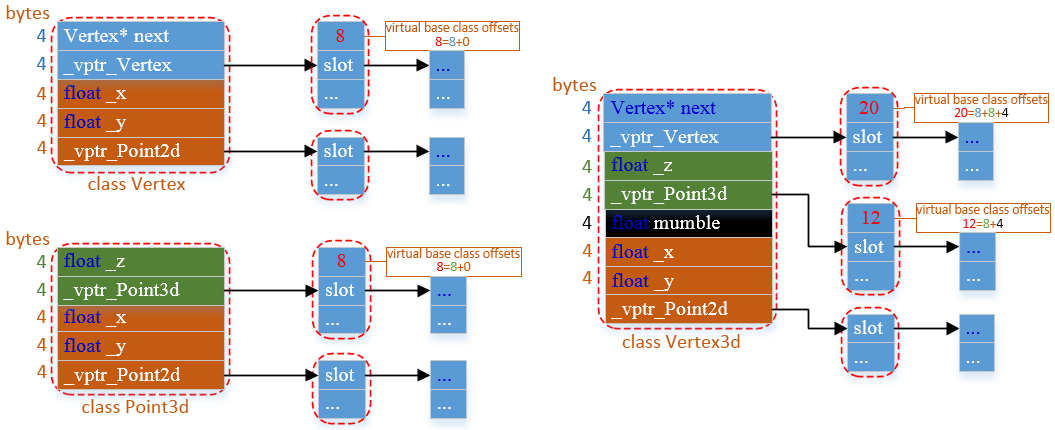 第二种办法也是建立 virtual base class table,但 table 中存放的不是地址,而是 virtual base class 的 offset(如下图)。