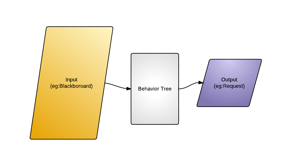 行为树的实现可以有多种多样,一般来说,行为树每个节点需要有进入(Enter),离开(Exit),运行(Execute)等部分,需要有行为节点(ActionNode),控制节点(ControlNode),前提(Precondition)等基类,然后,还需要定义行为树的输入(InputParam)和输出(OutputParam),一般来说,我们希望行为树是一个黑盒,也就是说,它仅依赖于预定义的输入。输入可以是黑板(Blackboard),工作池(Working Memory)等等数据结构,输出可以是请求(Request),或者其他自定义的数据结构,如下图: