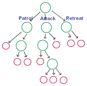 这是我们为一个士兵定义的一颗行为树(可以先不管这些绿圈和红圈是做什么的),首先,可以看到这是一个树形结构的图,有根节点,有分支,而且子节点个数可以任意,然后有三个分支,分别是巡逻(Patrol),攻击(Attack),逃跑(Retreat),这个三个分支可以看成是我们为这个士兵定义的三个大的行为(Behavior),当然,如果有更多的行为,我们可以继续在根节点中添加新的分支。当我们要决策当前这个士兵要做什么样的行为的时候,我们就会自顶向下的,通过一些条件来搜索这颗树,最终确定需要做的行为(叶节点),并且执行它,这就是行为树的基本原理。