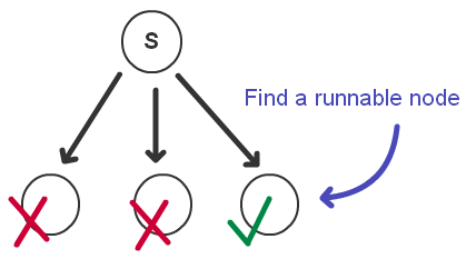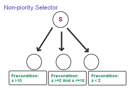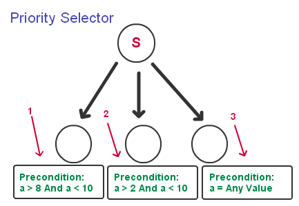 这种选择节点每次都是自左向右依次选择,当发现找到一个可执行的子节点后就停止搜索后续子节点。这样的选择方式,就存在一个优先级的问题,也就是说最左边的节点优先级最高,因为它是被最先判断的。对于这种选择节点来说,它的子节点的前提设定,必须是“从窄到宽”的方式,否则后续节点都会发生“饿死”的情况,也就是说永远不会被执行到,为了更清楚的说明,看下面第一张图,这三个子节点在一个带优先级的选择节点下,它们的前提会被依次判断,可以看到这个三个子节点的前提从左向右,一个比一个更严格,如果我们现在 a 为 9,按照下图的定义会执行第一个子节点,如果 a 为 7,则会执行第二个子节点,如果 a=11,则会执行第三个子节点。下面的第二张图演示了一种节点“饿死”(Starvation)的情况,我们看到第一个子节点的前提,比第二个子节点更宽泛,只要 a<10,那自左向右判断的话,永远会进第一个节点,所以,如果要用到带优先级的选择节点,则必须检查每一个子节点的前提,以防止节点饿死的情况。