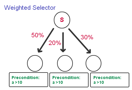 对于这种选择节点,我们会预先为每一个分支标注一个“权值”(Weight Value),然后当我们选择的时候,采用随机选择的方式来选,随机时会参考权值,并且保证已经被测试过的节点不会再被测试,直到有一个节点的前提被满足,或者测试完所有的节点。带权值的选择节点对于子节点前提由于随机的存在,所以子节点的前提可以任意,而不会发生“饿死”的情况,一般来说,我们通常会把所有子节点的前提设为相同,以更好的表现出权值带来的概率上的效果。当所有子节点的权值一样时,这种选择节点就成为了随机选择节点(Random Selector),带权值的选择节点对于需要丰富 AI 行为的地方,非常适用,比如养成类游戏中,小狗表示开心的时候,可能会有各种各样的表现,我们就可以用这种选择节点,添加各种子节点行为来实现。